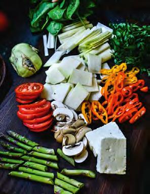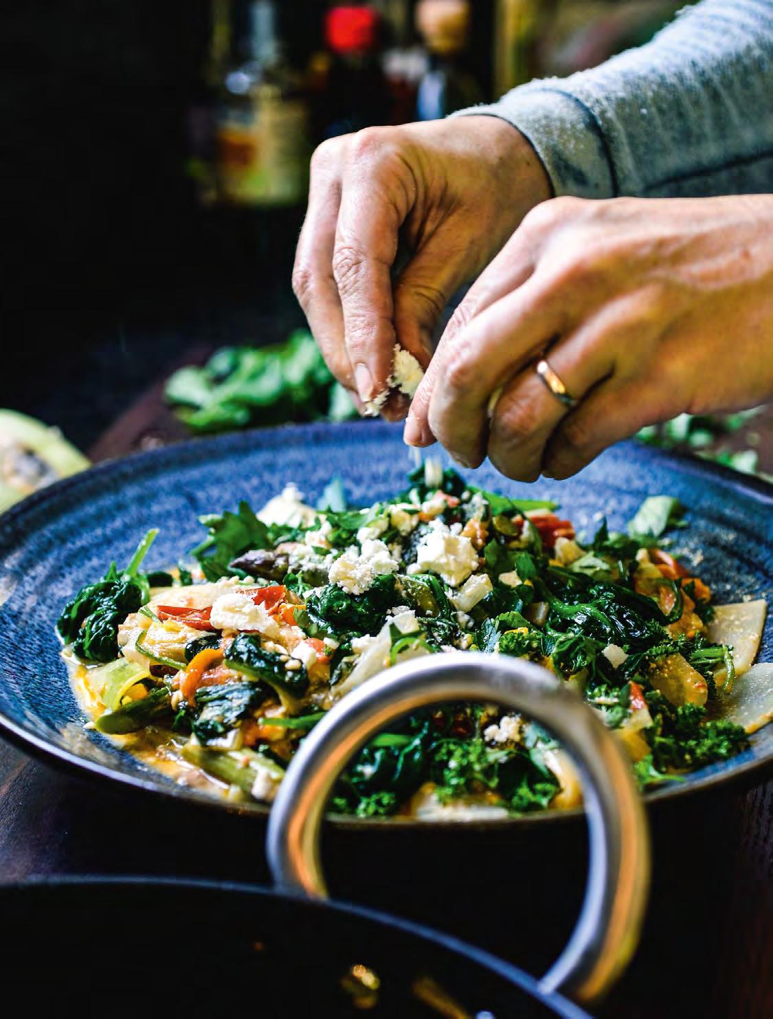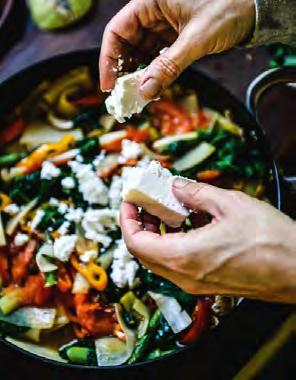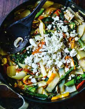 Dice all the hard vegetables (see tip) into small pieces and cook them, covered, in plenty of olive oil and a small amount of water. Meanwhile, cut the softer vegetables into various different shapes: slices, cubes, strips ... and add them to the hard vegetables. Season with salt and pepper and cover the pan again. Stir occasionally and add a little olive oil if necessary. Let the vegetables sauté for about 7 minutes. Crumble three quarters of the feta over the vegetables and cover once more. After a minute, remove the pan from the heat. Add the nuts and the finely chopped herbs. Serve in an attractive bowl and garnish with the remaining feta.