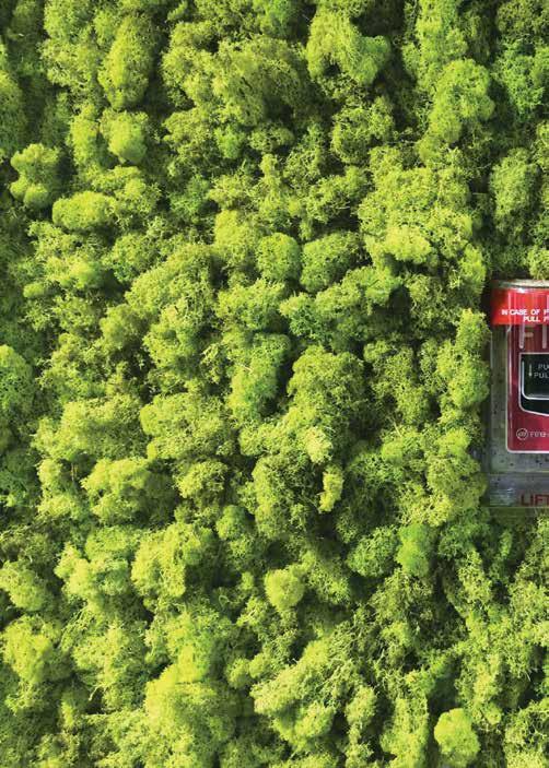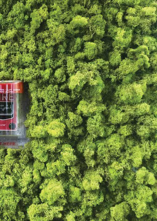 5 While the creeping spread of the not-quite-living “living green wall” (the name itself positively vibrates with a sense of barely repressed threat) seems to have had an out-sized impact in hotel lobbies and the occasional corporate office interior, the otherwise institutional entryway of a historic greenhouse conservatory on Chicago’s West Side, of all places, strikes a discordant tone. I spent an afternoon lurking in the lobby, trying to seem nonchalant while watching with rapt fascination as a disinterested facilities member opened bag after bag of dried lichen and hot-glued it to the wall. Your vision wanders around the periphery of the surface and your eyes can so easily create the impression that you’re hovering at low altitude over a charmingly even-tinted forest in a helicopter or perhaps a small prop plane. The stubborn impropriety of the fire alarm, which seems rudely unaware of its presence in disrupting the scene, can easily be redacted by closing one eye and holding up a thumb to blot-out the scale, and suddenly the forest seamlessly reemerges.