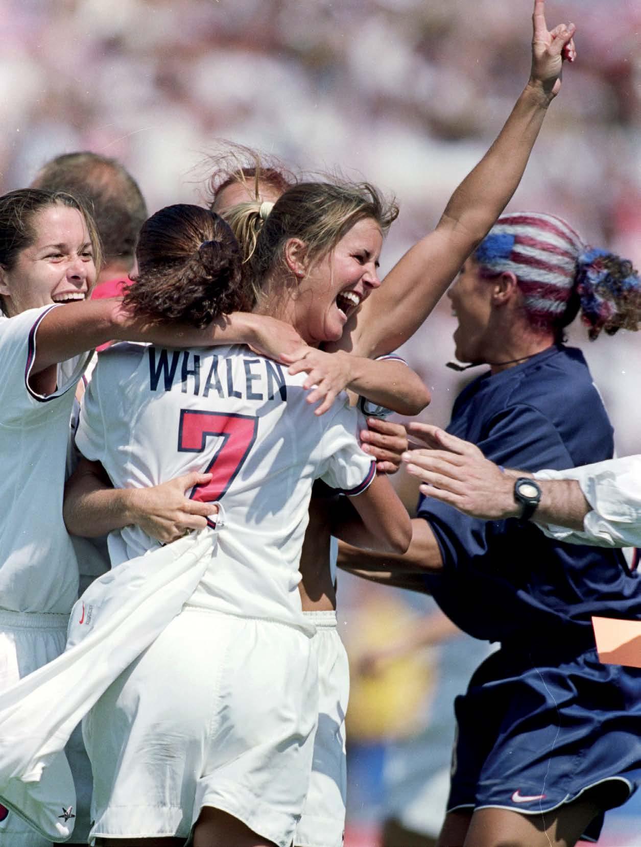 US player Brandi Chastain celebrates with her teammates after winning the 1999 Women’s World Cup final against China at the Rose Bowl in Pasadena, California.