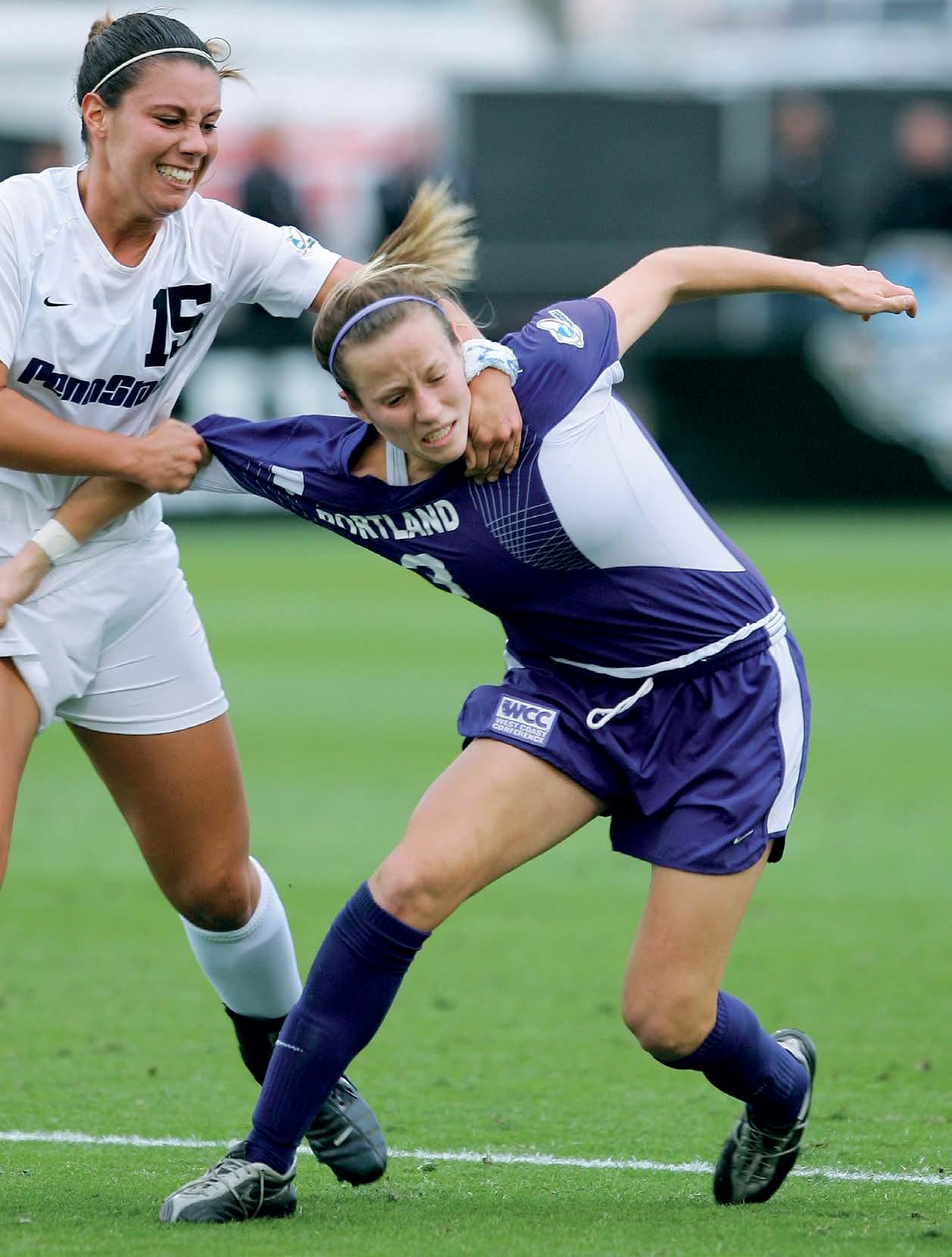 Penn State player Lindsay Bach jerks Portland's Megan Rapinoe away from the ball during the 2005 NCAA Women's College Cup semifinal game on December 2, 2005, at Texas A&M’s Ellis Field, College Station, Texas.