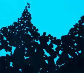 Where light strikes the surface of the film, the silver halide crystals dissociate. Electrons shoot off the bromide salts. Loose and cruising through the emulsion, they gather at aberrations in the gelatin and, gathering a positive charge, pull in the silver, now gone ionic. Attraction, repulsion, silver to electron, electron from bromide. The molecules rearrange in the pattern of the impact of light. From “Silver developing through an electron microscope,” 1945, Box 199, Folder 2, Kodak Historical Collection #003, University of Rochester. Image courtesy of Kodak. Color added by Feser and Lazarus