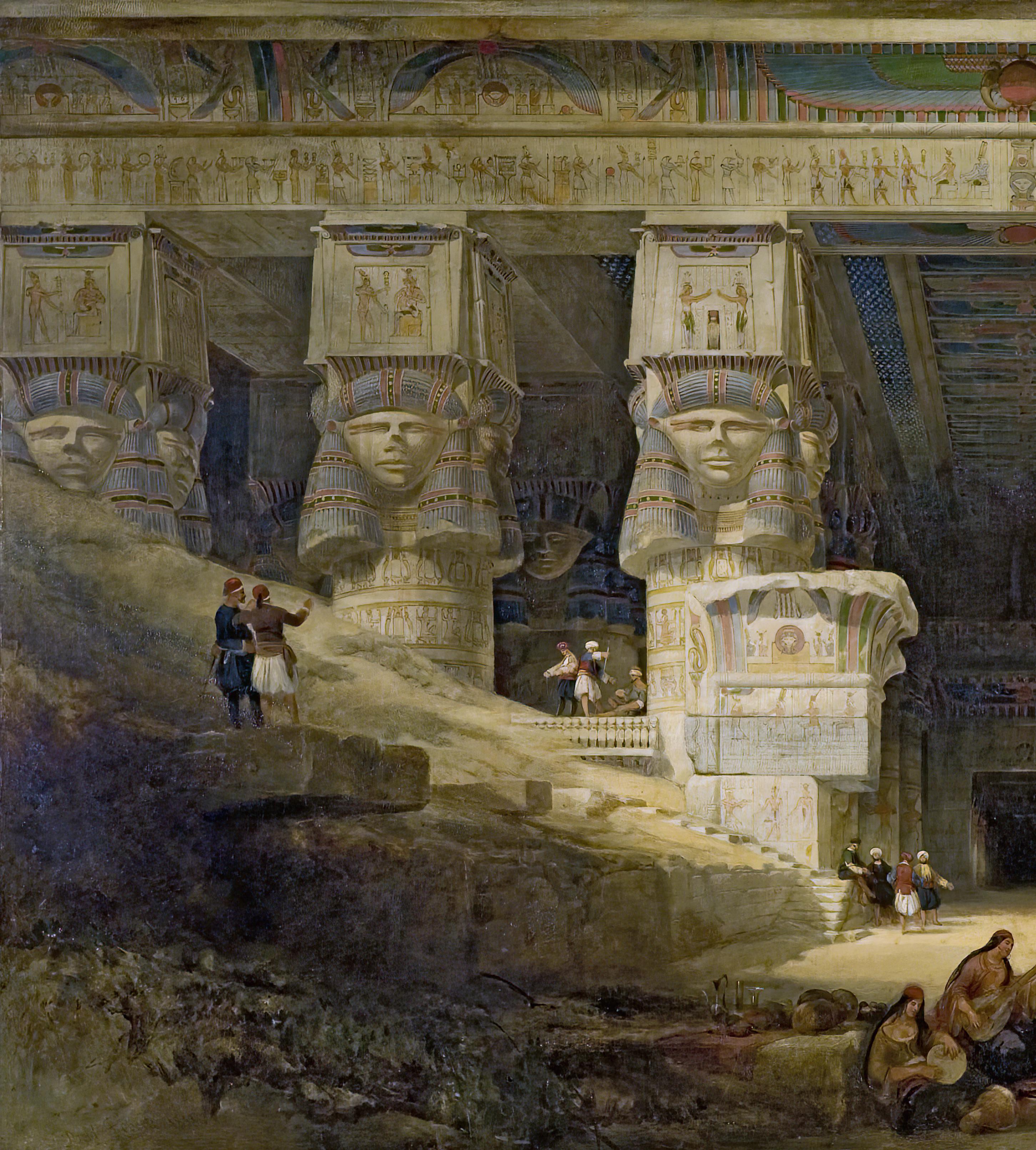 Around 1850, all those passionate about the East—and particularly Egypt—must have been thrilled when the first great photograph albums were published. Photography was then in its infancy. The operators—pioneers in their field— went on site equipped with extremely cumbersome devices and a laboratory’s worth of chemicals, not to mention the glass plates they also had to carry. They went east, to Egypt or Palestine, coming at first from France as much as from Great Britain. The photographs they brought back were often of invaluable help to painters. Eugène Fromentin employed a series of photographs by Wilhelm Hammerschmidt in order to complete his painting titled Sur le Nil (“On the Nile”). The photographers were also sometimes themselves influenced by the paintings of their artist friends, as is shown by the strong aesthetic connections between certain British photographers, like Frank Mason Good, and the PreRaphaelites. The photographs sometimes brought to mind poses in works from Salons.