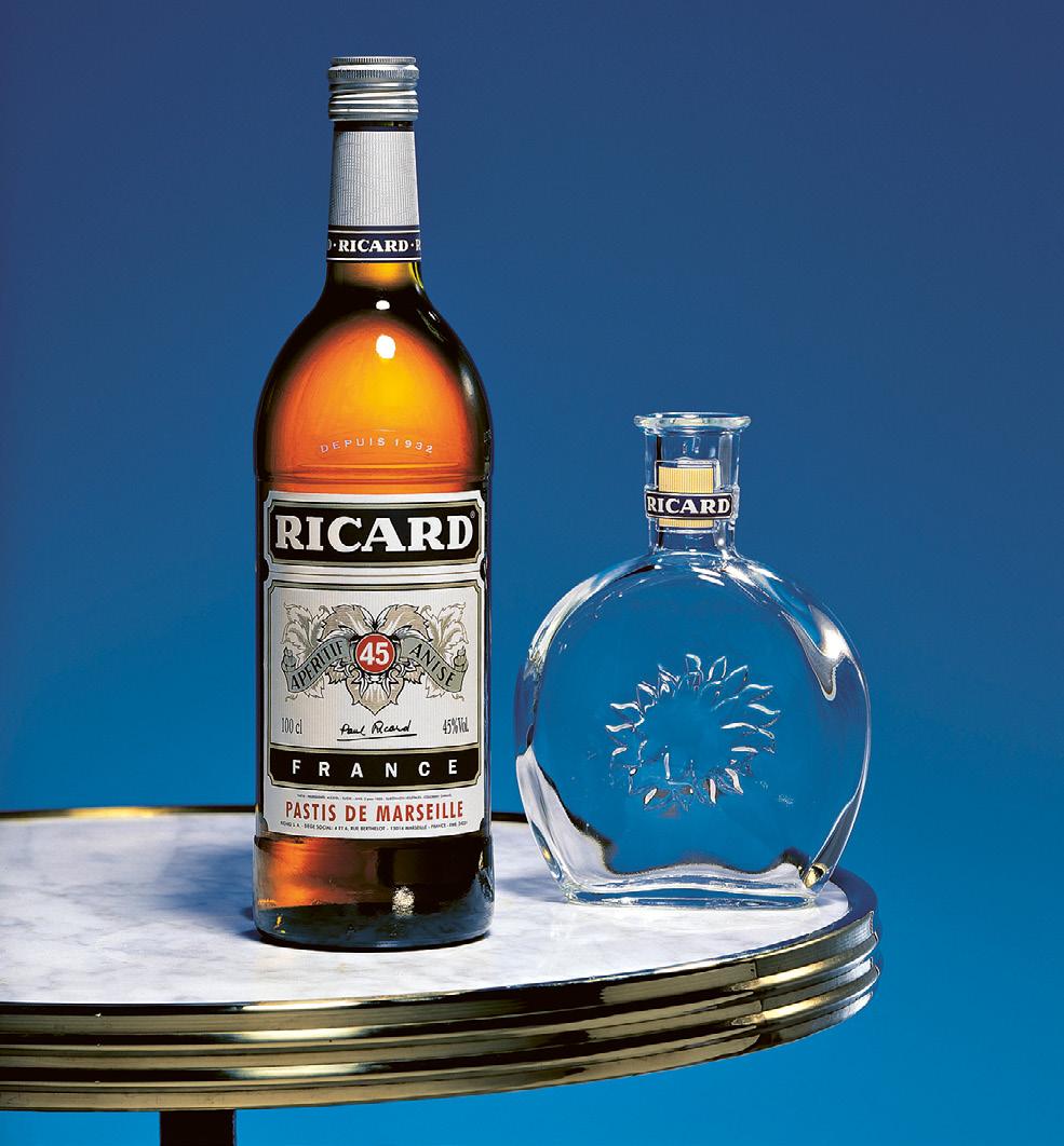 The introduction of limited editions from the early 1990s led people to question what had been considered a perfectly balanced design. The label was no longer an untouchable element, and the entire surface of the bottle was now destined to be used—provided that the Ricard cartouche remained visible. The success of the Garouste & Bonetti carafe distributed in cafés and restaurants from 1995 opened a second breach in the system. Consumers so strongly associated the sun motif with the brand that this design, perhaps derived from old menus and other leaflets distributed through the HoReCa (hotel, restaurant, café) sector, migrated onto the pastis bottle.