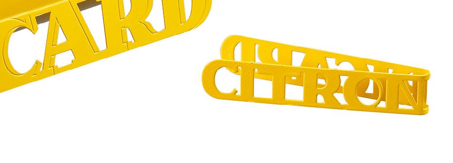 « J’ai souhaité donner une dimension ludique à cet objet en jouant sur l’articulation du montant et de l’ardoise elle-même et dans le face-à -face des couleurs Ricard : le jaune lumineux et inaltérable du montant et le bleu profond de l’ardoise dont la densité variera au fil des menus. »