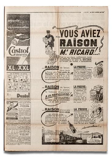 Ci-dessus et page de droite, en bas : Publicité presse Ricard insérée dans Le Petit Journal du 12 juillet 1939, vantant l’essor national du «  vrai pastis de Marseille » auprès des débitants et consommateurs. Above and bottom of facing page: Ricard press advertisement inserted in Le Petit Journal on 12 July 1939, extolling the national popularity of “le vrai pastis de Marseille” among tobacconists and consumers.