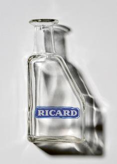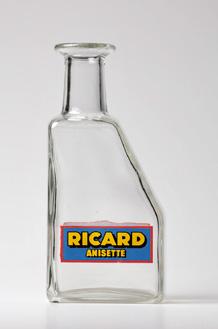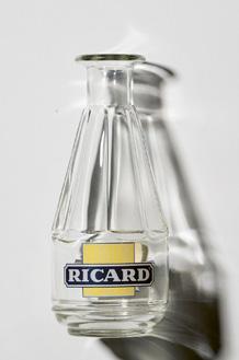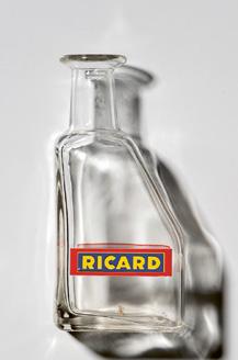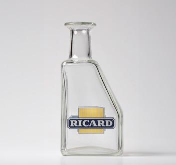 Les premières carafes en verre remontent à 1934. On y lit, moulé en relief ou en creux, Anis Ricard. Dire que le broc a d’emblée été concurrencé par la carafe relève du simple constat. Comme pour les autres objets publicitaires, les Trente Glorieuses correspondent à une période de développement de la production. Un nouveau modèle est distribué à partir du début des années 1950, la carafe à facettes qui est produite, en suivant les changements de logo, jusqu’au milieu des années 1990. Un autre modèle, plus facile à ranger dans les étagères, la carafe rectangulaire, apparaît à la fin des années 1960. Sa fabrication se poursuit également jusqu’au milieu des années 1990. Et ce n’est pas un hasard. En 1995, est lancée la carafe Garouste & Bonetti, fruit du partenariat entre Ricard et l’agence Kreo. Il s’agit du premier objet de designer distribué par la marque. Le succès est immédiat et spectaculaire –les garçons de café rapportent aux représentants Ricard que plus d’un client quitte sa table en l’emportant discrètement. Ses formes arrondies qui rappellent celles d’une gourde et ses soleils en relief la rendent immédiatement reconnaissable.