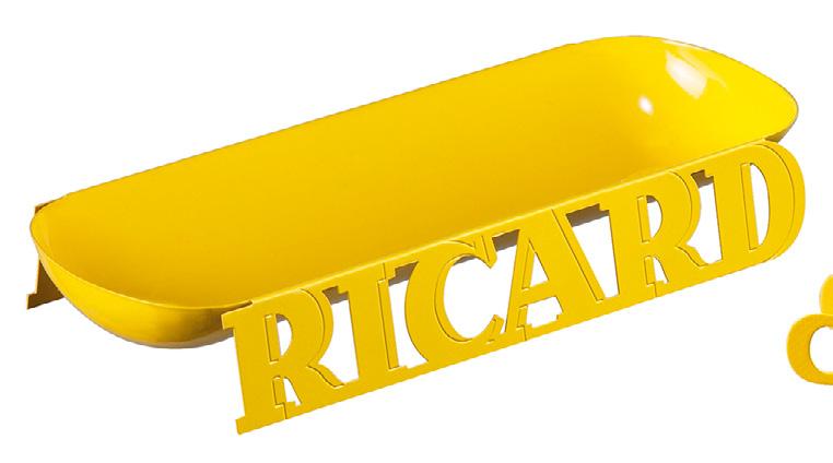 a playful dimension by working on how the stand and the board itself connect, and on the interplay of Ricard’s signature colors: the bright, unfading yellow of the stand and the deep blue of the board, whose intensity changes with each new menu.”