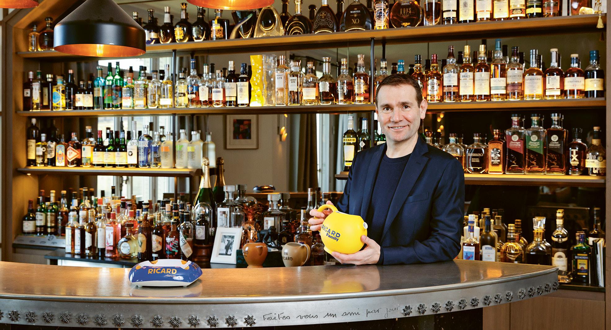 Alexandre Ricard, président-directeur général du groupe Pernod Ricard, derrière le bar de son domicile parisien. Il tient le broc Ricard conçu par le studio 5.5 en 2018. Sur le zinc est posé un ancien cendrier Ricard. La bordure du comptoir est décorée d’anis étoilés entre lesquels a été gravé le mot d’ordre de Paul Ricard à ses représentants : « Faites-vous un ami par jour ».