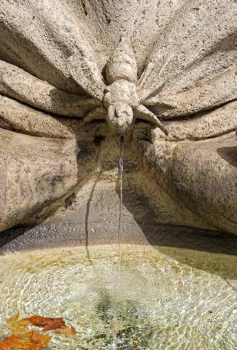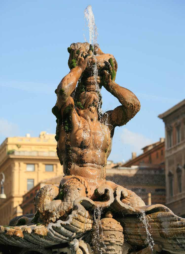 The fountain represents the decorative focal point of the small square, with its rich decorations of shell-shaped basins in polychrome marble and travertine with the refined bronze attributes of ephebes riding dolphins; the turtles were added by Gian Lorenzo Bernini only in 1658.