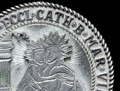 Ɉ The Saint Mary’s Bread Plate (1676) Silver circular plain dish-shaped bread plate with reeded border. Diameter: 25.4cm. Weight: 15oz. Mark: Maker’s mark ‘P.P.’ in a shield; Leopard’s head crowned; Lion passant; Date letter ‘P’ for 1672–3.