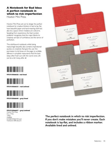 A Notebook for Bad Ideas A perfect notebook in which to risk imperfection Hoxton Mini Press Hoxton Mini Press set out to design the perfect notebook for creative thinkers: it had to lay flat, have beautiful paper and hard-wearing cloth but also be a space where mistakes are welcome. Speaking from experience, the East London publisher recognizes that the major blocks to creativity are lack of confidence and the terror of perfection. This clothbound notebook, whilst being reassuringly beautiful, also contains inspirational quotes on creativity that give the user the permission to let loose on the page, to scribble silliness in complete reassurance that the best ideas often flush out with the worst ones. Life can be a bit messy, after all.