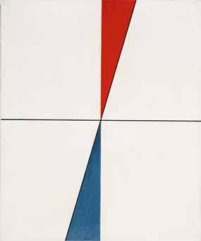 The variation in distance between the individual forms further intensifies this impression. With few colors, mostly blue and red, rarely yellow or green, she accentuates the compositions and dynamizes the black-and-white arrangements. The painting Composition à rectangles et cercles 109 can be considered the nucleus of all the variations that follow (fig. 28). Circles, squares, rectangles, and bars are as often grouped in systematic order as they are placed outside the sequence as individual elements. She uses blue, red, and gray to emphasize separate forms in both segments. Pointe sur pointe 110 (fig. 29) shows an even closer relationship to Composition (deux disques coupés par une ligne) in formal terms. A horizontal black line divides the white ground into two halves. Two acute triangles, with their respective bases at the upper and lower edge of the picture, collide with one another exactly at the midpoint of the line. A black contour line the length of the right-hand edge of the upper, red triangle, and the length of the left-hand edge of the lower, blue triangle, could be read as vertical pendants to the horizontal black line. If one were to imagine both triangles rotating toward the center line, and thus collapsing or becoming hidden behind the ground, only the contour line would remain visible, or two black lines, thus dividing the ground into four equal rectangles. The black lines anchor the composition’s status quo within the picture, and thus avoid the impression of infinity that the white ground gives in Composition (deux disques coupés par une ligne)