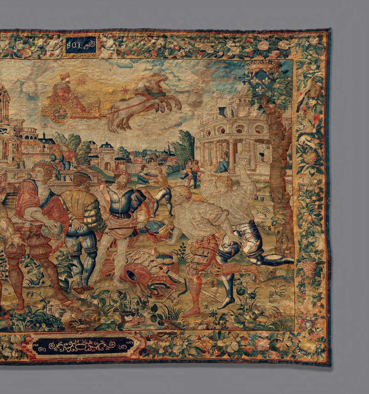 With the heraldic shield (gules, on a thin fess sable three cinquefoils argent; on a chief or a raven sable) suspended from a branch of the central tree, this plate recalls two others bearing the same arms, as yet unidentified with any certainty: a plate devoted to the Bible story of The Gathering of Manna , kept at the Walters Art Gallery (Baltimore, inv. 48.1514), and a smaller dish in the Musée du Louvre, featuring, after the Aeneid Sinon brought before Priam (inv. OA 1592). These resemblances point towards the dish at the Fondation Gandur pour l’Art as having belonged to a service devoted to the major themes of ancient and biblical history, probably made at the most prolific workshop in Castel Durante in the mid-sixteenth century, namely the Picchi brothers.