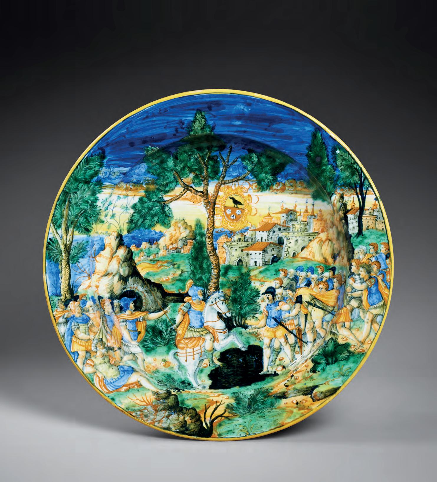 As specified in the inscription on the back of this dish, 1 the depicted scene is taken from an episode recounted by Livy in his History of Rome (VII, 6): the Sacrifice of Marcus Curtius. After an earthquake opened up a gaping hole in the midd le of the Forum, an opinion of the gods recommended sacrificing to it whatever was the main strength of the Roman people in order to fill it. A young warrior answering to the name Marcus Curtius considered that this strength lay primarily in weaponry and courage, and demonstrated as much by throwing himself over the precipice. The scene here shows Marcus Curtius at the precise moment when, riding his richly decked horse, he leaps into the abyss – materialised by a large black spot – in the midst of a crowd of Romans spread across either side of the composition.
