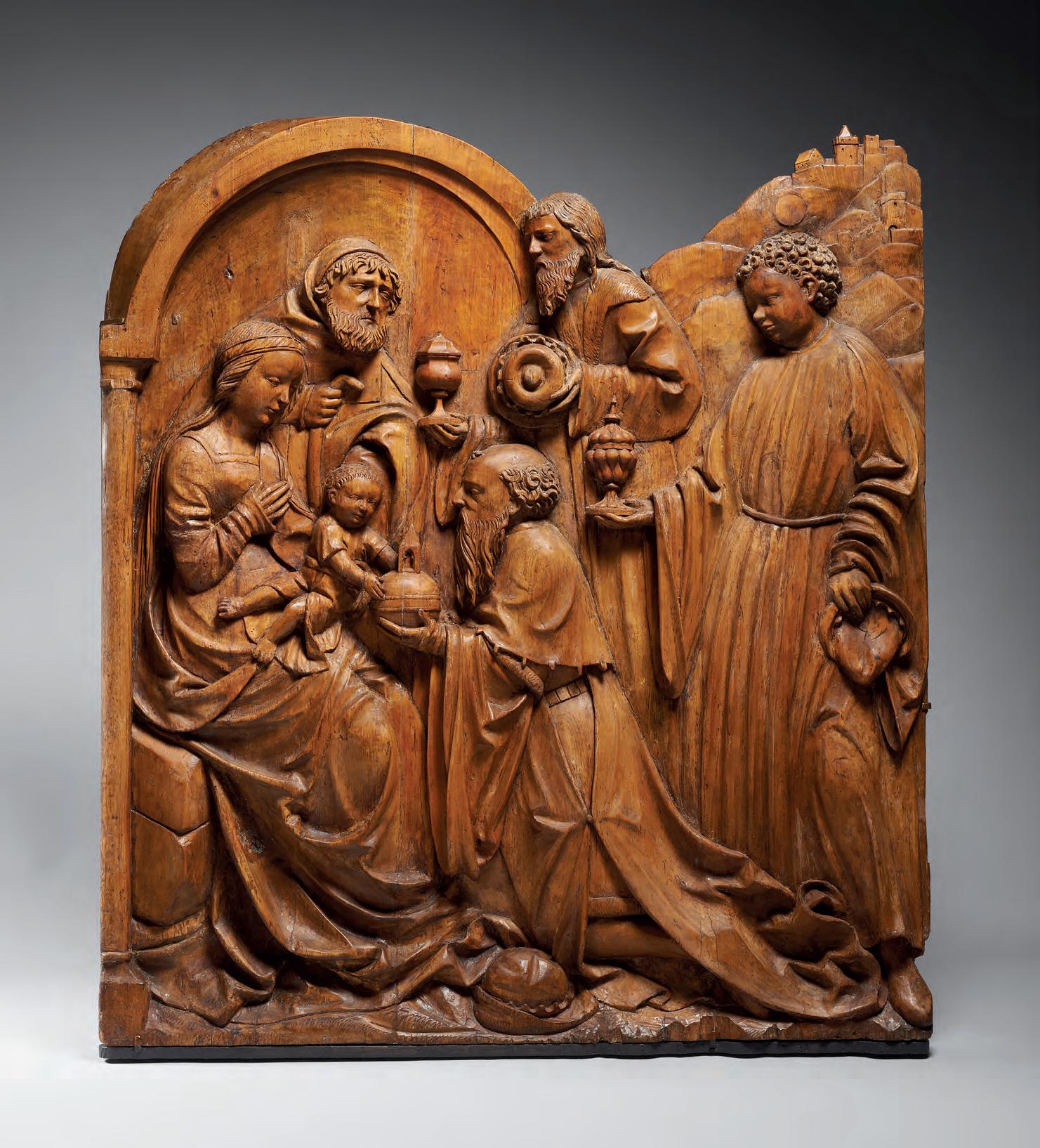 The limewood bas-relief represents the Adoration of the Magi deployed in two distinct spaces, one enclosed by a curved arch over the Holy Family, the other carved along the skyline of the hilly landscape. The Virgin holds on her lap her son who receives a round cup from the eldest magus, kneeling before him. Standing behind him, his two companions each bear their gift in one hand and their hat in the other, under Joseph’s watchful gaze. Joseph is depicted as an old man, leaning on a stick, standing back a little from the adoration scene per se, according to a tradition common in Germanic parts since the early fifteenth century. One of the magi is black, following a motif whose invention dates back roughly to the 1360s, and which became well-nigh systematic as early as the 1440s, whether in painting or sculpture. The peaceful atmosphere of the scene of paying homage is echoed by the delicate gentleness of the faces, particularly so in the case of the Virgin Mary, while the men have more distinctive features, in line with a masculine-feminine opposition that was common as the century was drawing to a close. The sculptor takes great care over a broad range of details, the hair for example, or items of costume such as the middle magus’s fur collar. The medium, the iconographical treatment, and the style all place this work in South Germany in the late fifteenth century.