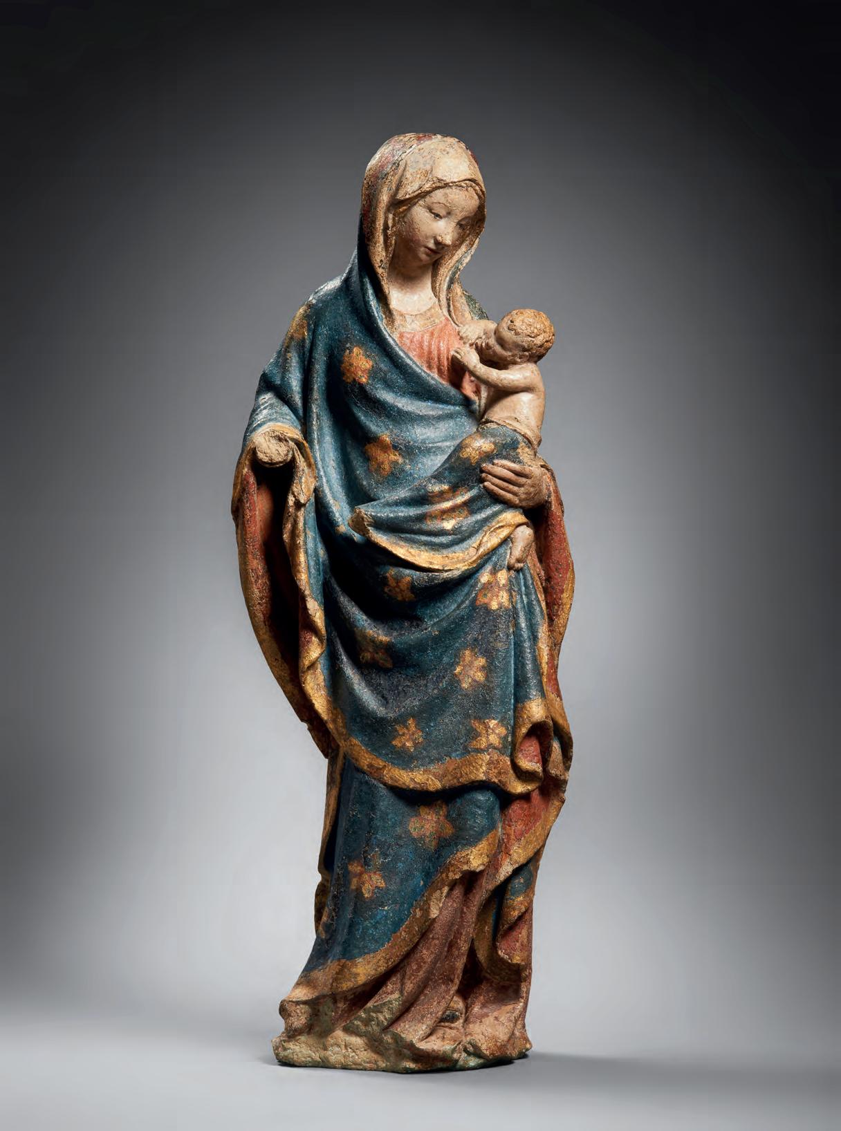 About fifty centimetres high, the graceful blue-cloaked Virgin is depicted suckling her son, following an iconography much used in carvings coming out of late-fourteenth-century Paris. Standing, she carries him on her left arm and tenderly gazes at him as he undoes her bodice with his two tiny hands in search of the breast. The Child, with chubby cheeks and curly locks, is pictured half naked, the lower body being swaddled in a fabric identical to the one his mother is wearing.