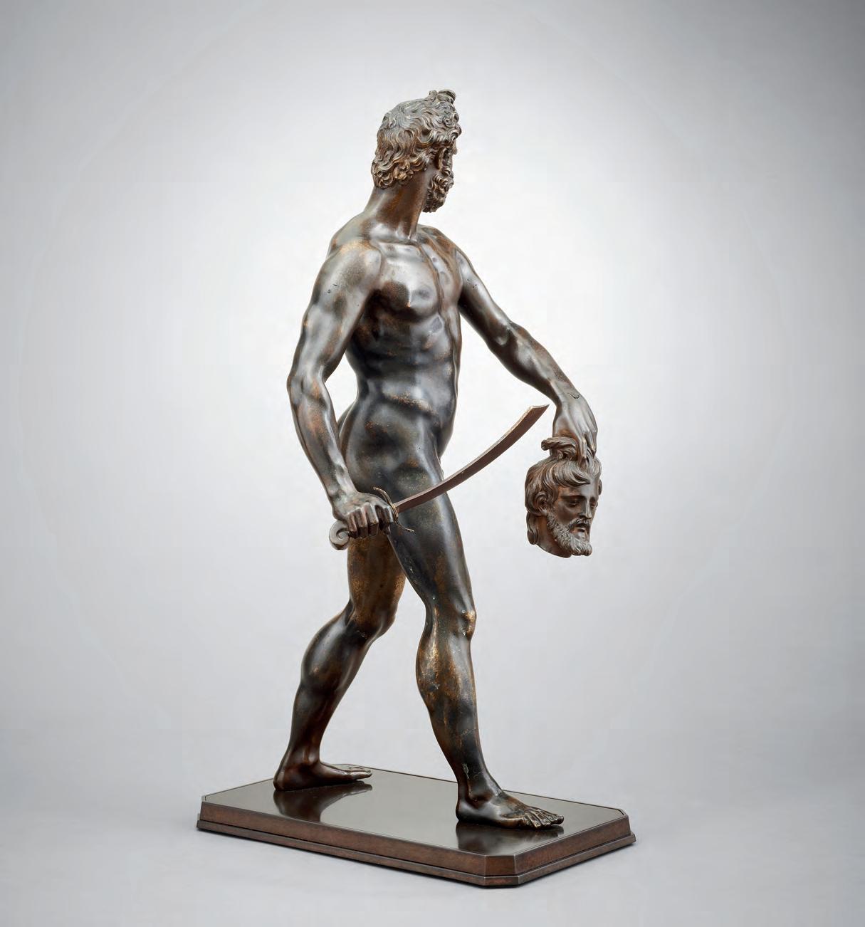 A variant by Massimiliano Soldani Benzi possessing this attribute (National Gallery of Ireland, Dublin, inv. 8122) shows in the stream of blood a reference to Benvenuto Cellini’s Perseus group, which therefore places it firmly within the Florentine tradition. In the copy at the Fondation Gandur pour l’Art, the neck is severed cleanly and the classicism of the features, evidenced by the broad, smooth forehead, the straight nose, and the hair worked in silky ribbons, is more reminiscent of the circle of Alessandro Algardi. The he ad in fact closely resembles certain sacred bronzes that brought success to the Bolognese sculptor long after his death, such as the Baptism of Christ (Cleveland Museum of Art, inv. 1965.471), the Flagellation (Kunsthistorischesmuseum, Vienna, inv. Schatzkammer, D.127), or the St Nicholas of Tolentino (National Museum of Palazzo Venezia, Rome, inv. 10760). 3 It also recalls the work of François Duquesnoy, the only artist apart from Algardi who, according to Giovanni Pietro Bellori, was capable of elevating sculpture to the excellence of Antiquity 4 and who executed a similar group representing an execut ioner holding the head of John the Baptist for the confraternity of San Giovanni Decollato in Rome. 5 The same title was given to the group by Soldani Benzi, maybe with reference to St John the Baptist as the patron saint of Florence. It is however more difficult to make a similar claim for the Fondation Gandur pour l’Art bronze, given its overtly profane tone, the lack of any meaningful attributes, and above all the fully baroque contrast between the ferociousness of the executioner and the victim’s irenic expression.
