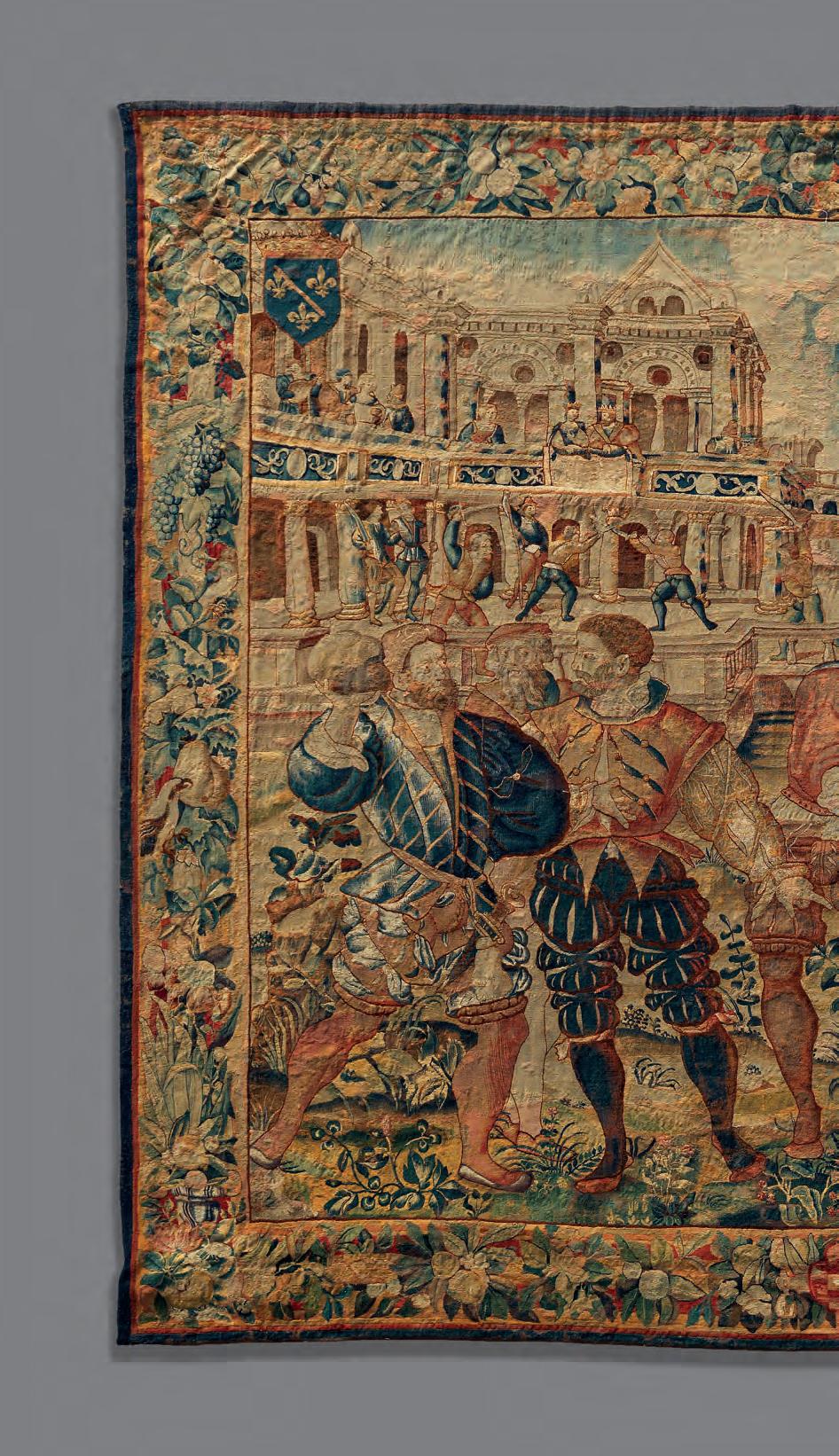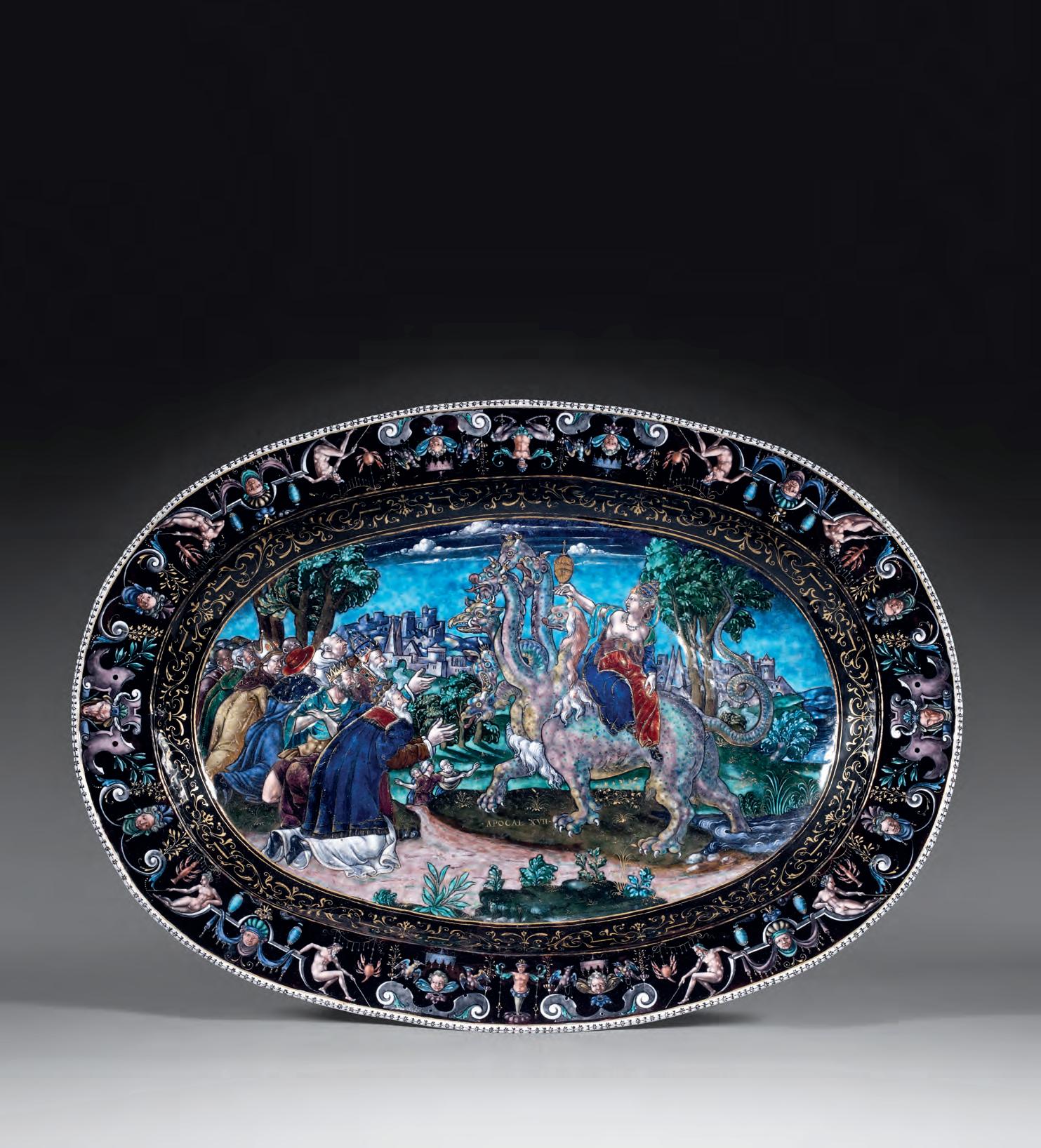 This work, which represents a genuine technical feat on account of its large dimensions and the use of numerous silver paillons (leaves) set off with translucent coloured enamels, is characteristic of the polychrome enamel production on a black ground in Limoges in the late sixteenth century.