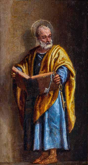 School of painting of the late Renaissance. When Brownlow visited Venice in June 1769, during his second Tour of Italy, he succeeded in acquiring a number of costly paintings by this very sought-after master, which had belonged to the destitute church of San Jacopo on the island of Murano. The works in question are two organ shutters with life-size portrayals of Saint James and Saint John, and the central panel of an altarpiece with a representation of Salome, wife of Zebedee, beseeching Christ to favour her sons, John and James.102 The panel came to hang in the chapel of Burghley House –apparently there was no objection to its Catholic character. Hamilton must have done Brownlow a very great favour by giving him these costly paintings. Both apostles are portrayed barefoot and standing. Peter, the first bishop of Rome and therefore a key figure in the dissemination of Christianity, holds an opened book and is recognisable by his attribute, the keys to the kingdom of heaven. Paul, whose biblical writings were also important in spreading the Christian faith, is portrayed clutching a book under his left arm and using his right hand to support a sword, the means of his beheading and martyrdom. The small size of the canvases suggests that they were studies for large-scale likenesses of these two saints.