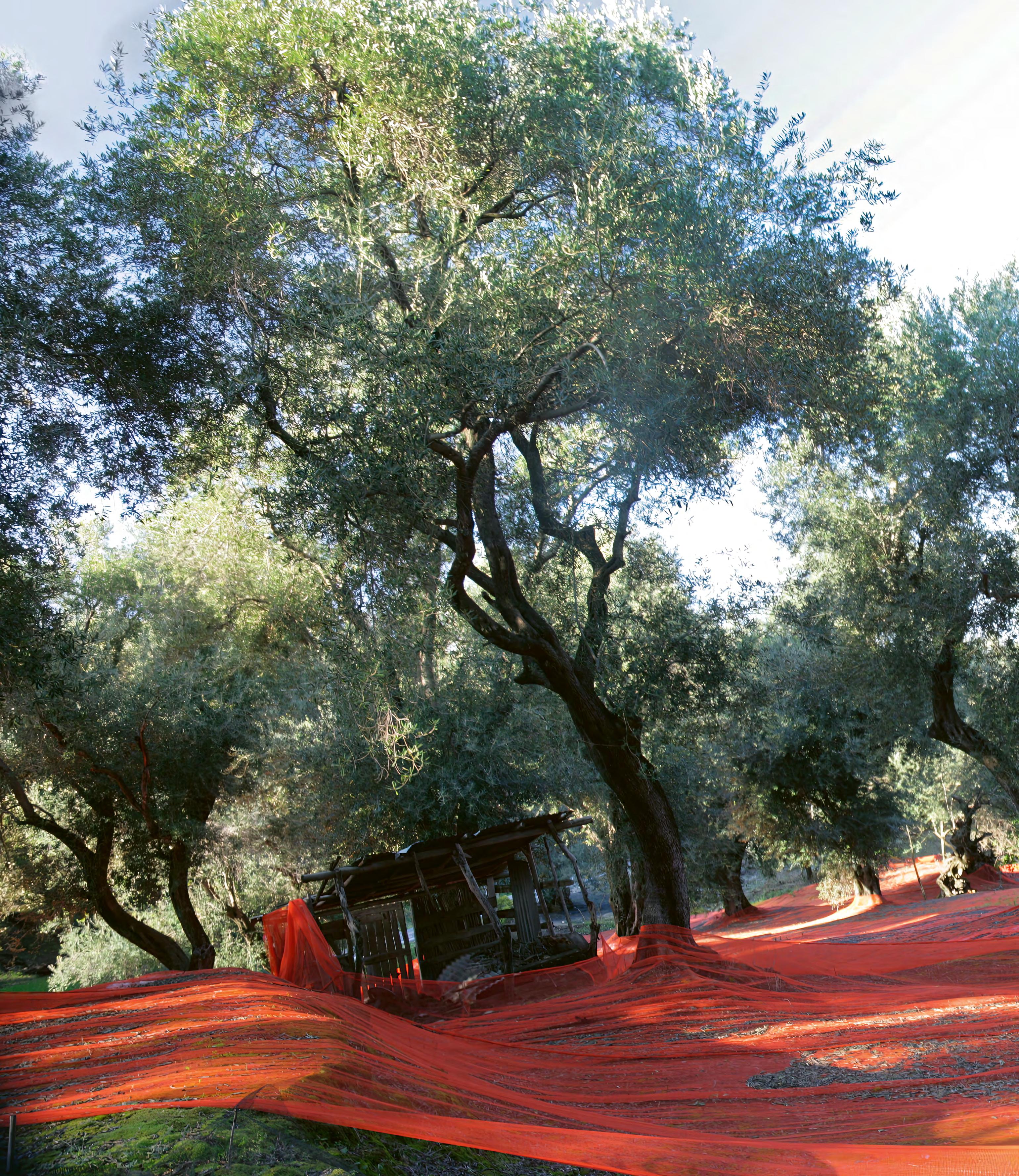 Towering olive trees that let their olives fall to the ground to be collected little by little, Corfu (Greece)