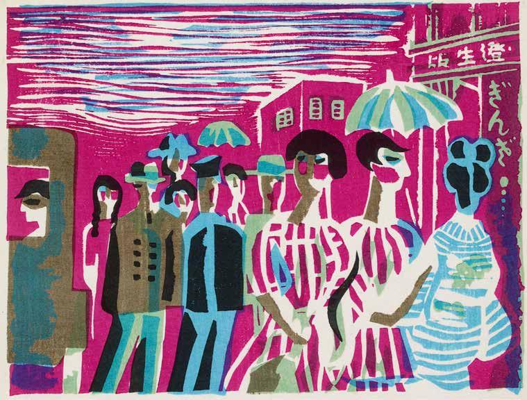 However, Tokyo once again rose from the ashes. A major symbol of Tokyo’s post-war renaissance was Tokyo Tower, a broadcasting tower completed in 1958. Constructed partially from scrap metal salvaged at the end of the war, at a height of 333m it was for a long time the tallest structure in Japan (only superseded by the Tokyo Skytree in 2012). It quickly became a prominent landmark in the city and was for Japanese people the leading symbol of Tokyo. The print by Kasamatsu Shirō illustrated on p.40 was published very soon after the tower was completed, while Takahashi Rikio (1917–98)’s print shows the same subject around thirty years later (p.10). The latter work is from the series One Hundred Views of Tokyo: Message to the 21st Century. For this project, undertaken between 1989 and 1999, one hundred leading print artists from the artists’ group the Japan Print