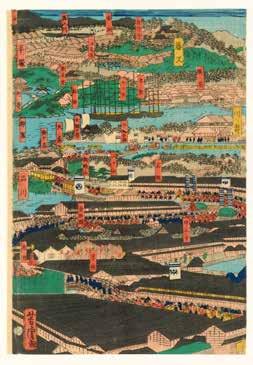 road space are disciplined, with people lined up on the sides.32 The print shows signs of having been hastily made, for example the varying colours of the labels of checkpoints along the Tōkaidō. These glitches point to the shapeshifting configuration of Japan’s landscape during the turbulent years that led up to the emperor’s move to the newly named Tokyo in 1868.
