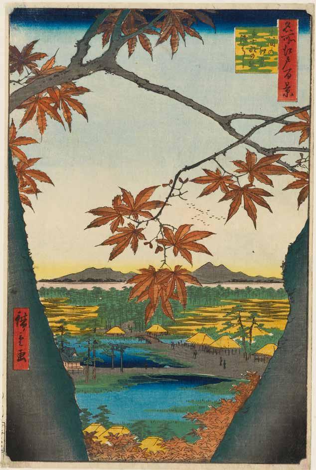 Utagawa Hiroshige, Maple Trees at Mama, Tekona Shrine and Linked Bridge (Mama no momiji Tekona no yashiro Tsugihashi), from the series One Hundred Famous Views of Edo (Meisho Edo hyakkei), 1857