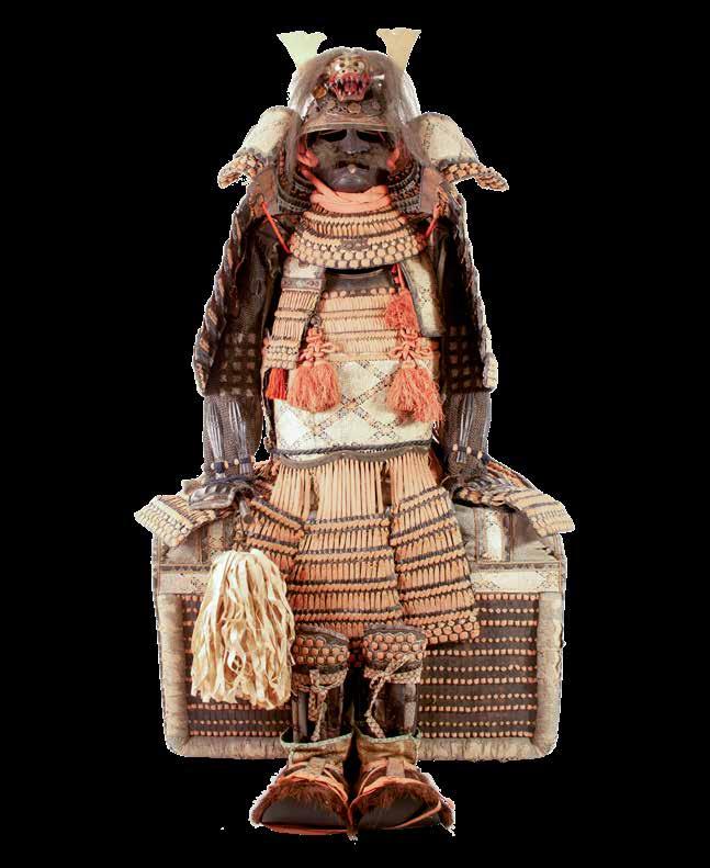 periods that recalled the glories of the samurai’s warrior past. The suit of eighteenth-century armour illustrated opposite belonged to Oda Nobuhisa, Lord of Ōmi province in central Japan. It incorporates a wide-spreading neck guard and large shoulder guards in a style that had been popular centuries earlier but had been abandoned as too cumbersome during the civil wars of the sixteenth century. The entire cuirass is wrapped with a sheet of printed deerskin. Again this was a feature that had been popular many years earlier as a method of keeping the braided silk lacing dry and protecting it from vermin, but here used solely for decorative effect.