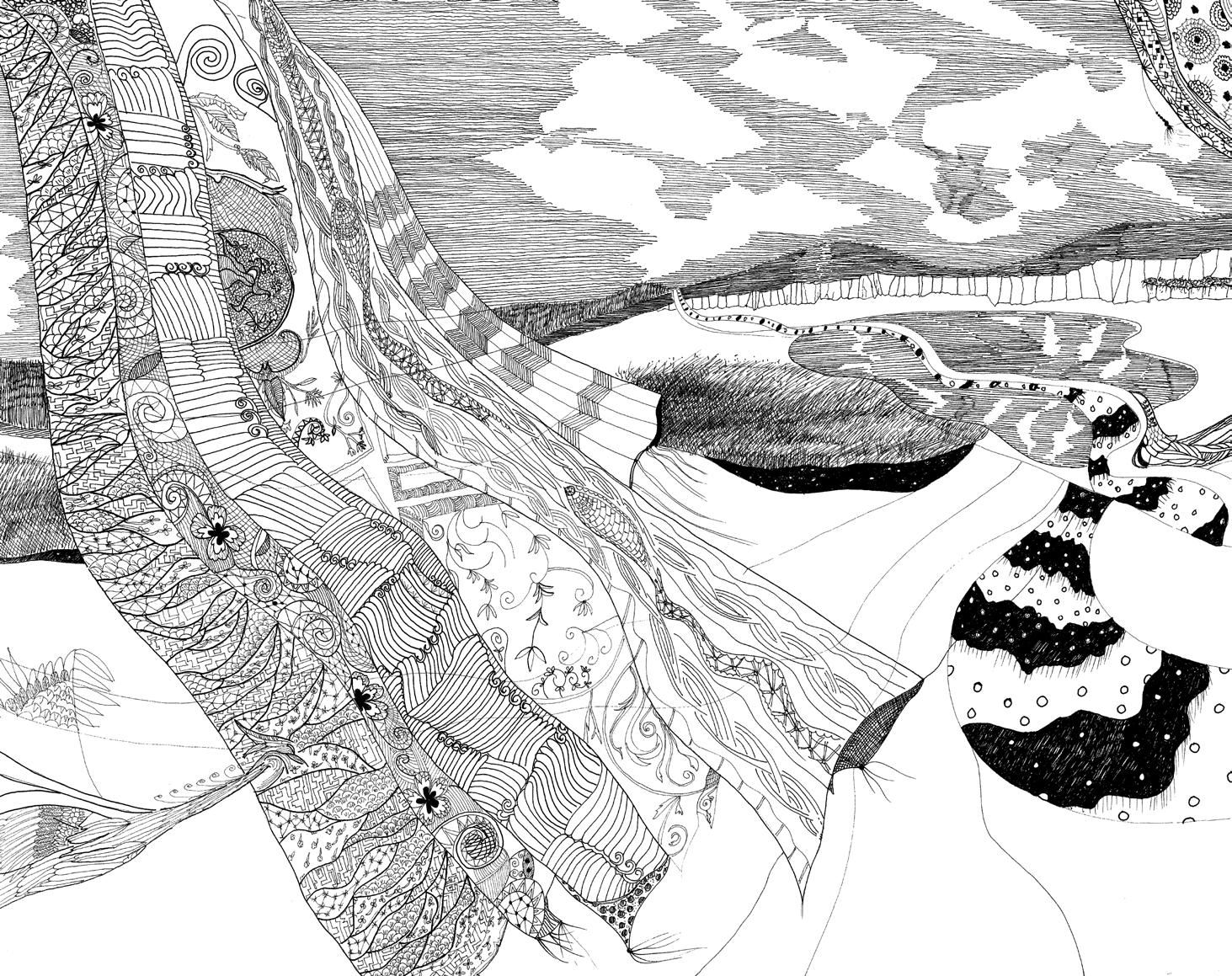 This Miller Pollin drawing series focuses us outward to a broad landscape from an interior perspective. In these intricate pen and ink drawings, we gaze through patterned, breeze-blown curtains to the patterns and perspective of the natural landscape.