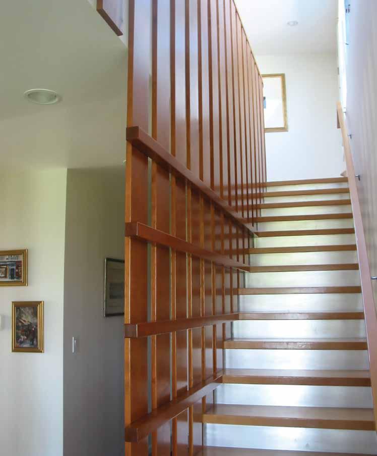 With three children and several large dogs, the Ransohoffs wanted to create more living space—two new bedrooms, a larger kitchen, and dining area. They commissioned Miller Pollin to renovate the dining area and add a new kitchen, an upper level den, and two children’s bedrooms. The challenge was clearly to maintain the integrity of the beautiful original post and beam structure while adding a significant amount of new space. Miller Pollin developed a scheme for a two-level addition. The stairs to the new second level combine polished stainless steel risers, clear Douglas fir treads, and screen wall planking. With many hours of homework ahead, the two children who would inhabit the second level needed places to study. The programmatic invention of a “crow’s nest” was cantilevered from each of the two new bedrooms, providing a quiet study place overlooking the nearby mature live oak trees. The house and addition are largely clad in white stucco, but the studies are wrapped in weathering copper whose tone plays off of the hue of the redwood frame of the original house. Horizontal plaster reveals and window mullions on the addition harmonize with the horizontality of the Gilman design.