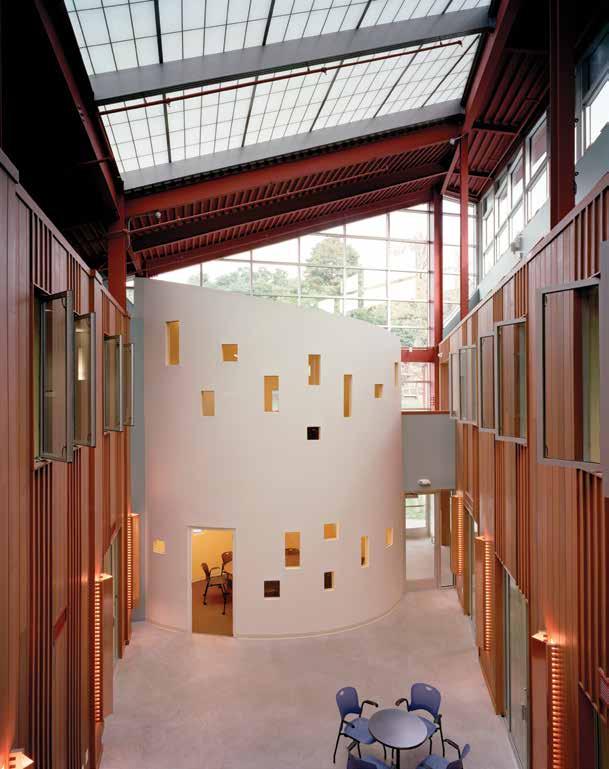 This building is beautiful with its rich blending of materials, colors, and lighting. It is also the first building on campus designed to operate under net zero standards. The design places a high level of value on spatial variety even within a constrained building envelope. Color and light bring warmth and comfort to public and private spaces. The site design reflects an integrated