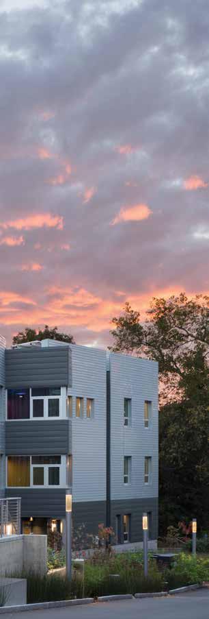 approach to sustainability by knitting together the architecture and the landscape architecture. The terraced rain gardens that line the northern bank of the building are fed by run-off from the roof, which is directed into vertical channels rendered in a dark gray zinc on the north elevation. The run-off irrigates the native plantings on the site. The plantings, in turn, filter the storm water as it flows down to a local wetland area. As these plantings mature, they will provide a soft, transparent layer composed of colorful perennials, woody plants and small deciduous trees between the driveway and the gray zinc of Crotty Hall.
