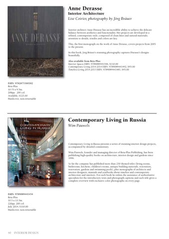 Anne Derasse Interior Architecture Lise Coirier, photography by Jörg Bräuer Interior architect Anne Durasse has an incredible ability to achieve the delicate balance between aesthetics and functionality. Her projects are developed in a refined, contemporary style, composed of clean lines and natural materials; attention to details, textiles and colors are key. This, the first monograph on the work of Anne Derasse, covers projects from 2005 to the present. In this book, Jörg Bräuer’s stunning photography captures Durasse’s designs beautifully. Also available from Beta Plus: Interior Spaces ISBN: 9789089441546, $110.00 Contemporary Living 2014-2014 ISBN: 9789089441492, $95.00 Timeless Living 2014-2015 ISBN: 9789089441485, $95.00