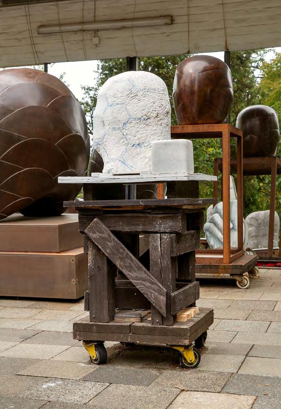 Das Werk von Hede Bühl (*1940) fokussiert sich seit vielen Jahren auf ein zentrales Thema: die menschliche Figur. Dabei geht es der Künstlerin nicht um individuellen Ausdruck, sondern um grundsätzliche skulpturale Fragen. Ihre bekannteste und umfangreichste Werkgruppe sind die Kopfskulpturen, die Bühl aus Stein, Bronze, seltener aus Aluminium, Blei oder Kunststoff fertigt. Sie sind einerseits auf einfachste Grundformen reduziert, andererseits aber durch Dehnungen, Wölbungen, Bänder und Klammern akzentuiert, die zu zahlreichen Interpretationen herausfordern, aber nie ihr Geheimnis preisgeben. Im Jahre 1980 übernahm Hede Bühl ein Atelierhaus in Düsseldorf. Im Laufe der Jahrzehnte haben sich Innenund Außenräume mit Skulpturen und großformatigen Zeichnungen gefüllt, die in immer neuen Arrangements ein sich ständig änderndes Bild abgeben. In einer Art Bestandsaufnahme dokumentierte Thomas Köster im August 2020 innerhalb eines Tages die besondere Atmosphäre im Atelier der Künstlerin. Herausgekommen ist ein Buch, das einen intimen Einblick in Bühls Arbeitsund Lebensumfeld ermöglicht.