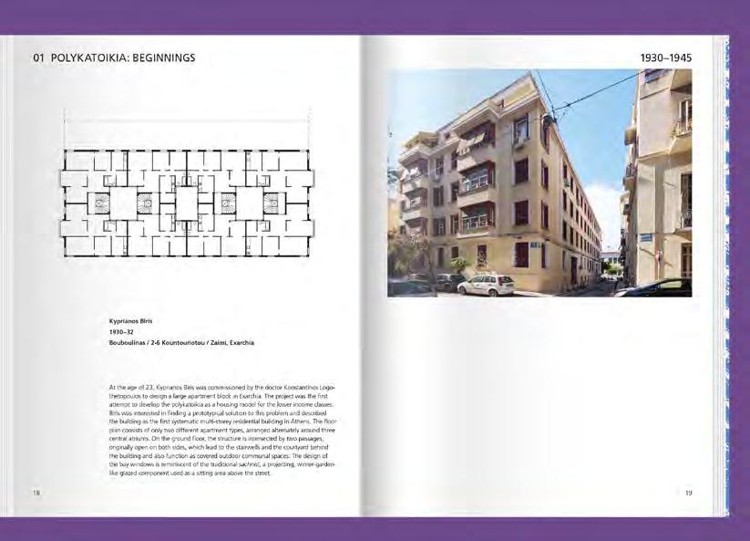 Das Buch begibt sich auf Spurensuche nach den architektonischen Ursprüngen dieser Typologie. Es untersucht zum ersten Mal umfassend die architektonischen Konzepte, die von griechischen Architekt*innen für den Polykatoikia-Typ entwickelt wurden. 76 innovative Apartmentgebäude aus dem Zeitraum von 1930 bis 1975 werden mit aktuellen Fotografien, neu gezeichneten Grundrissen und kurzen Erläuterungstexten vorgestellt. Die Auswahl fördert eine erstaunliche Bandbreite an Konzepten zutage, darunter Entwürfe von Dimitris Pikionis, Aris Konstantinidis, Constantine Doxiadis und George Candilis. Die chronologische Ordnung zeichnet die Entstehung der Typologie nach, von den Modern-Movement-Polykatoikias der 1930er-Jahre über die Experimente der frühen Nachkriegszeit bis hin zu den ikonischen Polykatoikias der 1960er-Jahre. Zusätzliche Texte erkunden die Entwicklung zentraler architektonischer Merkmale des Polykatoikia-Typs und reflektieren die fortwährenden Kämpfe der Architekt*innen um dieses Wohnmodell.
