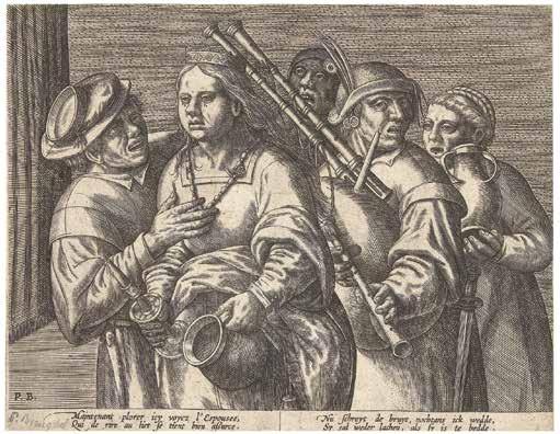 Originating in vernacular plays, the figure of the dirty bride derives from a corruption of het vuile bruidspaar (the dirty bride and groom) in which the woman is singled out. The dirty bride figure has clear associations with Carnival. She appears in vernacular Shrove Tuesday plays, including those about the battle between barren winter and fertile spring.21 In a print of the subject designed by Pieter Bruegel the Elder, viewers are actually witness to a group of Carnival actors performing a play featuring the dirty bride for donations (fig. 3).22 The actor playing the dirty bride wears a wedding dress of pelts and rags, and her at 155. See also Wallen, Jan van Hemessen, 64–66 and cat. no. 22, primarily following Renger’s analysis (Renger’s essay was originally published in 1977). Most recently, see Henneke, “Ritueel in beeld,” 121–127, and for a different interpretation of the relationship between the three figures, see Ubl, “Van hoerenhuis tot hoofse liefde,” 163–165.