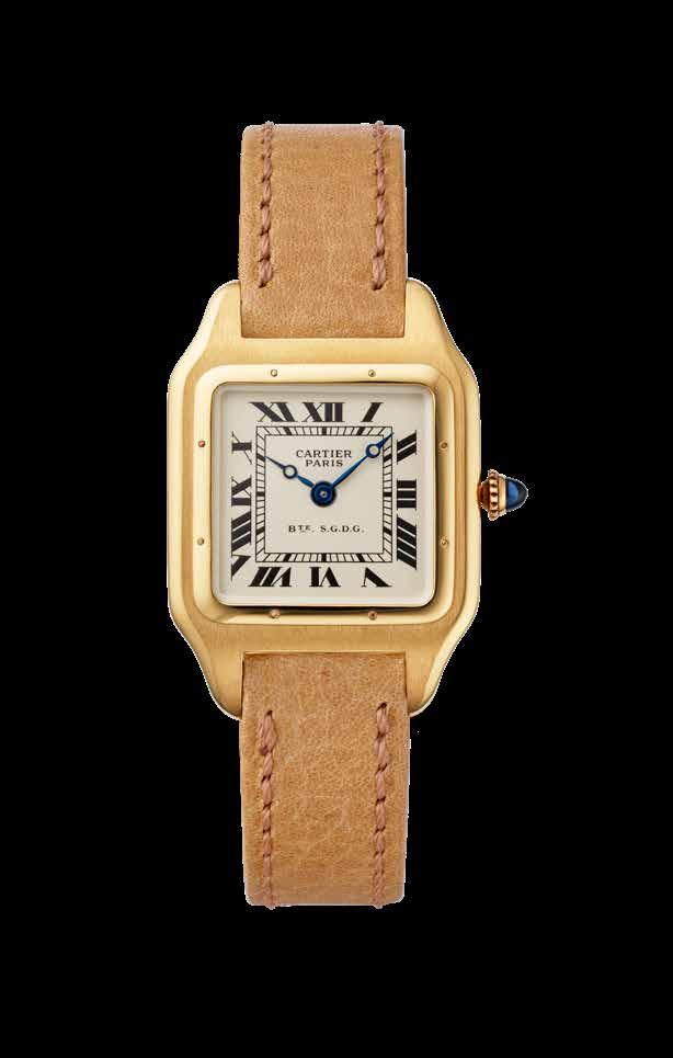 the first in timepiece history. The watch designed for Santos-Dumont had a square case with rounded corners, a screwed-in bezel with exposed screws, integrated lugs and a leather strap: practical and elegant. It is said that the aviator was so pleased with the result that he wore the watch on November 12, 1906, when he took off in the aircraft 14-bis he had built himself and by flying for 720 feet set the first distance record in the history of aviation. This event greatly impressed the elite of the day, who, seeing the aviator as a kind of influencer ante litteram, began to ask Cartier for the same watch. The first examples were delivered in 1911, when the maison launched series production; the abbreviated name, Santos, appeared that same year.