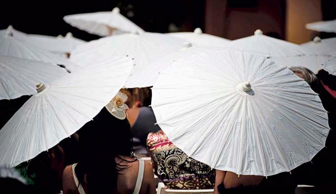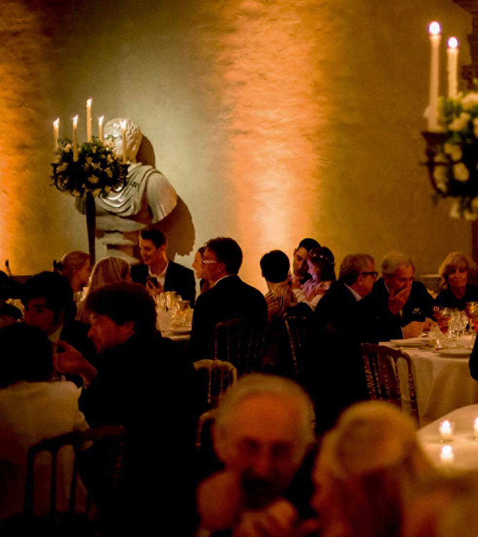 Under a white marquee flanked by turquoise poles with tiny red stars, which were reminiscent of circus decor, the lunch was served while the guests hardly sensed the surrounding metamorphosis. Between events, they could rest in the gardens and in the swimming pool ( they were given swimming gear commensurate with the epoch of inspiration ), until a master of ceremonies invited them to witness the show in an improvised drama theater.