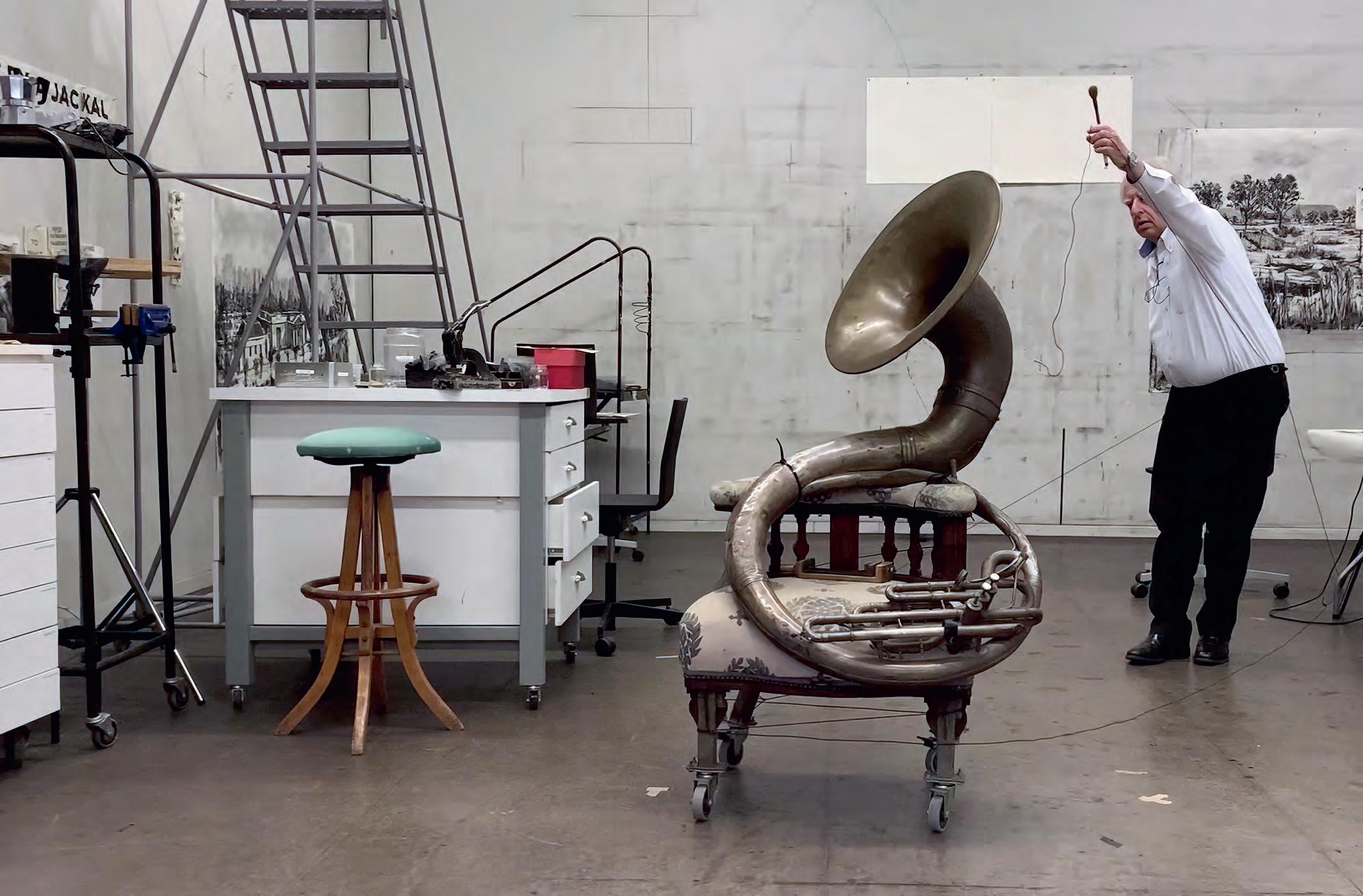 In a triumphant scene from a colonial film, a rhinoceros is shot by hunters; later the rhinoceros, turned gymnast, somersaults over a humanoid construction with megaphone head bearing the sign Trauerarbeit