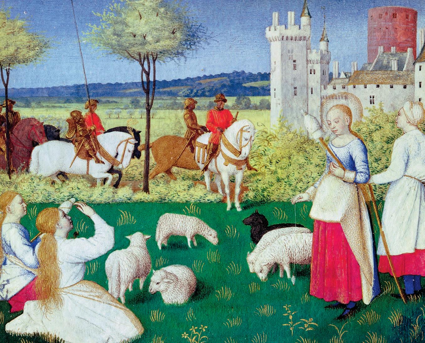 Here, women use distaffs to spin wool from sheep into thread in an illustration from the martyrdom story of Saint Margaret of Antioch.
