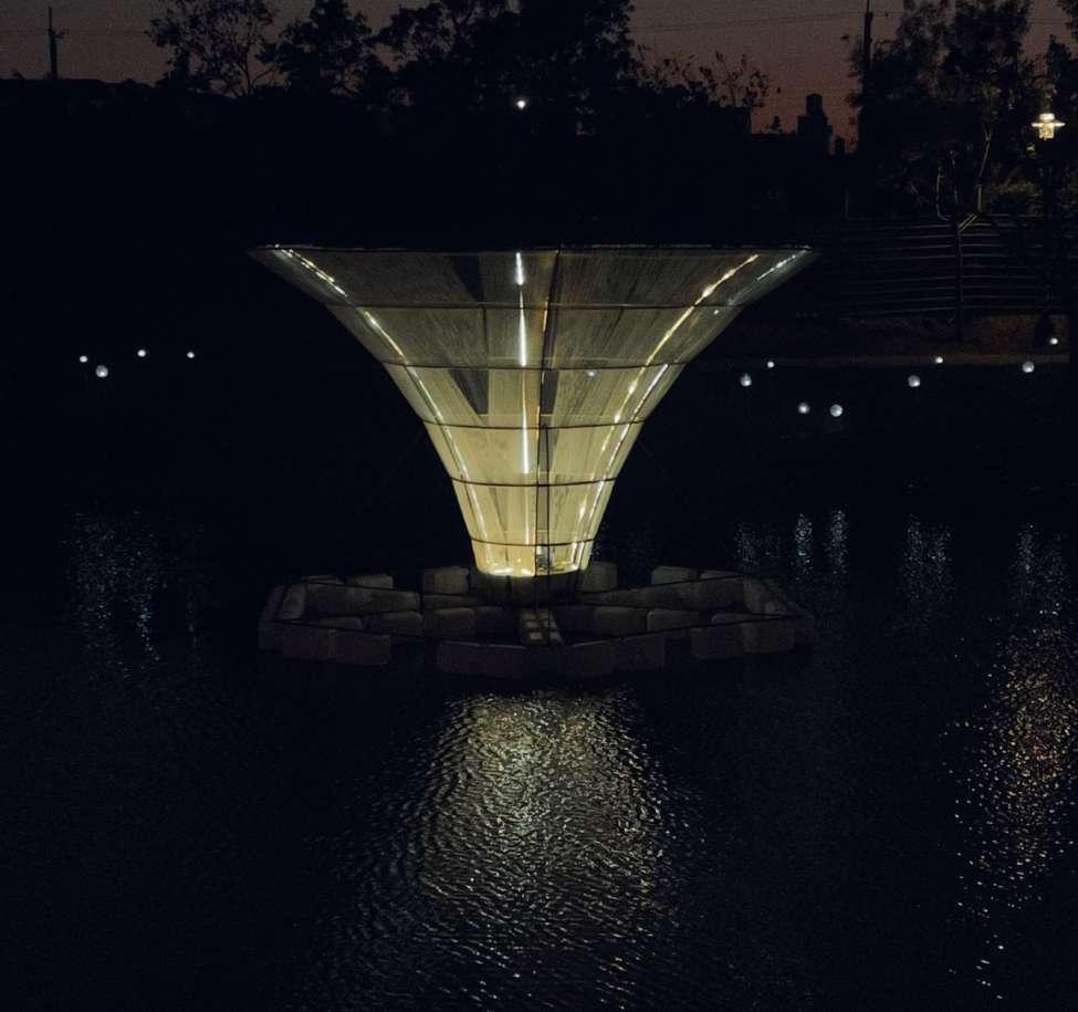 The interaction of mist, light, and nature is like the formation of new life in nebulae or the brilliant light emitted by a dying white dwarf. Life and death are natural, ordinary, and magnificent. The artwork takes half a form, with the other half reflected on the water’s surface, sometimes clear and sometimes blurry. Light reveals its existence, fostering anticipation for what the future holds, hoping that life can be as beautiful.
