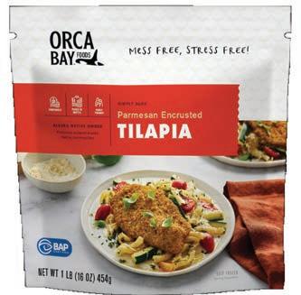 Parmesan Encrusted Tilapia 402201 ORCA BAY 10/16 oz bags These Tilapia are flash frozen within hours of being caught. Encrusted with a delicious, crunchy parmesan breading that's perfect for a mild white fish, they come ready to bake or fry for an easy healthy meal.