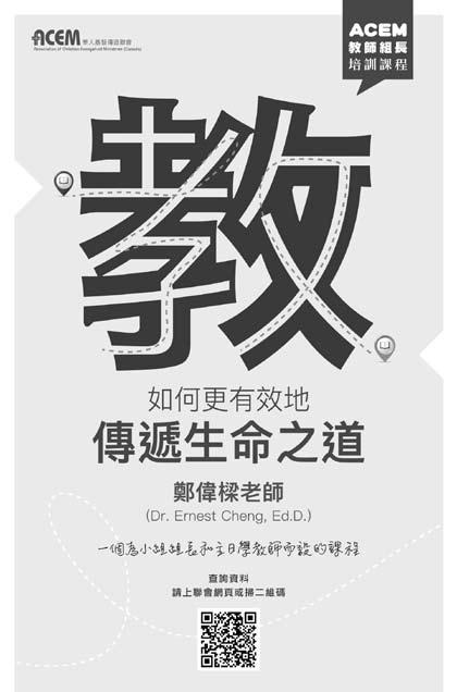 2. 華基聯會主日學教師培訓課程: 傳遞生命之 道(共八課,上下學期各四堂)。線上報 名: https://bit.ly/3PEH5db 。教員:鄭偉樑 老師 (Dr. Ernest Cheng, EdD)。授課地點:華 基聯會辦事處;日期:3-4月、5-6月。詳情 及查詢:acem.ca;Tel:(905)479-2236 ext. 300。