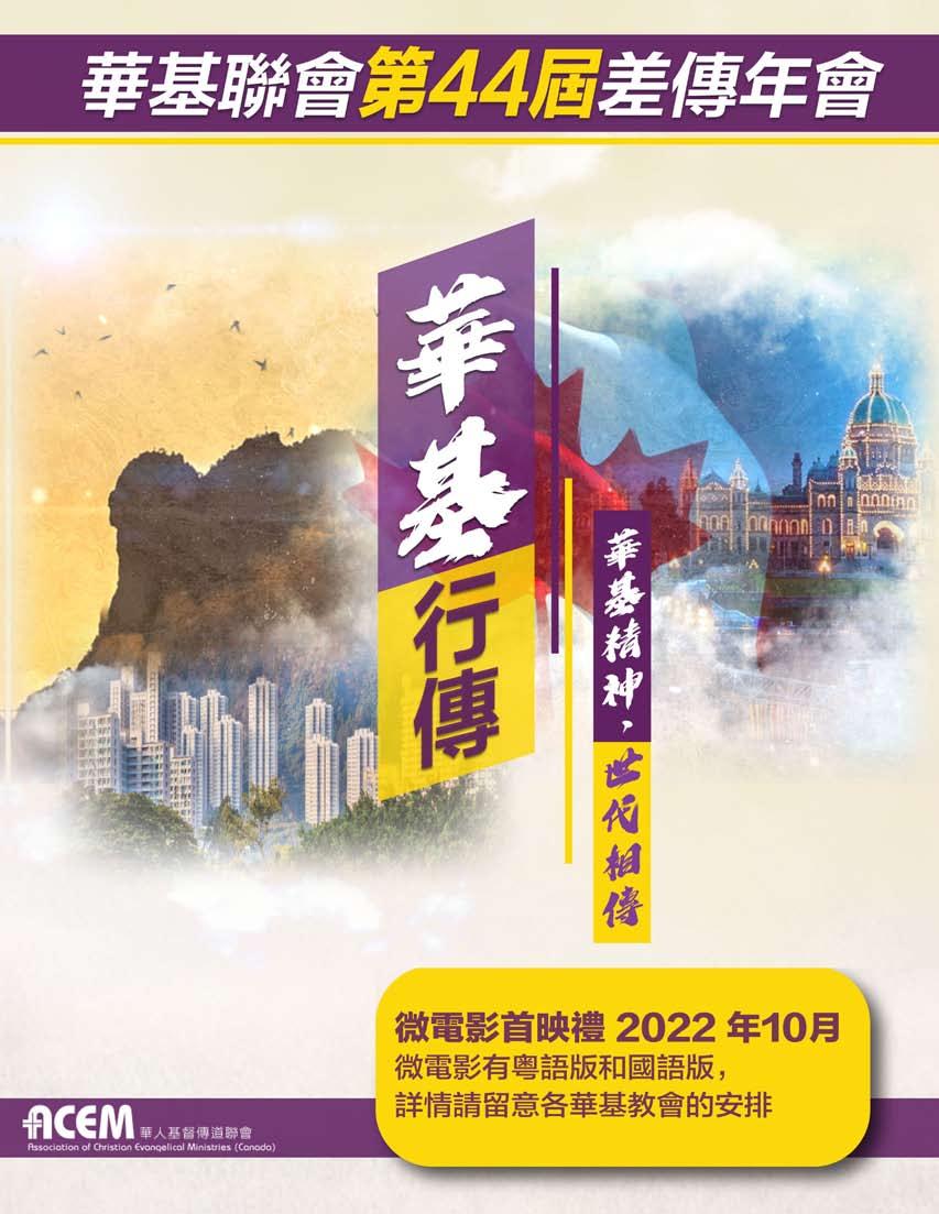 華基聯會第44屆差傳年會 華基行傳微電影首映禮 電影於十月中旬由各教會自選日期時間播放 微電影有語版和國語版, 詳情請留意各教會稍後的安排。 華基聯會差傳年會及主日崇拜講員介 英語