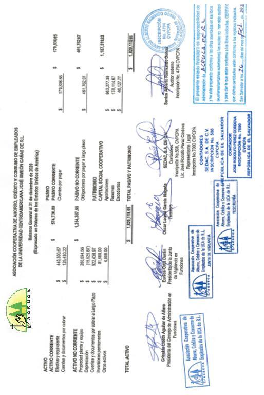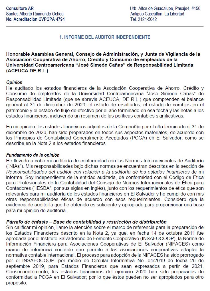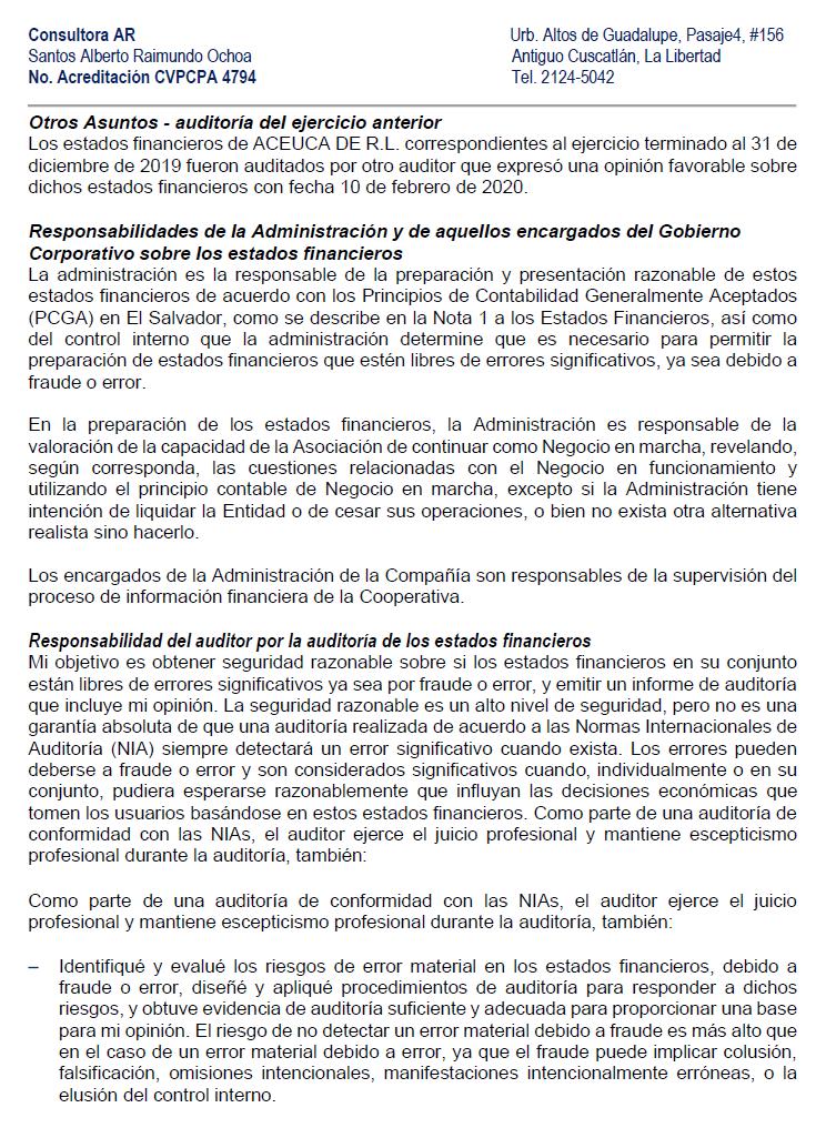 ✔ Ajustes contables realizados en base a las políticas contables establecidas en el sistema contable de ACEUCA y aprobados por la Asamblea General de Asociados.