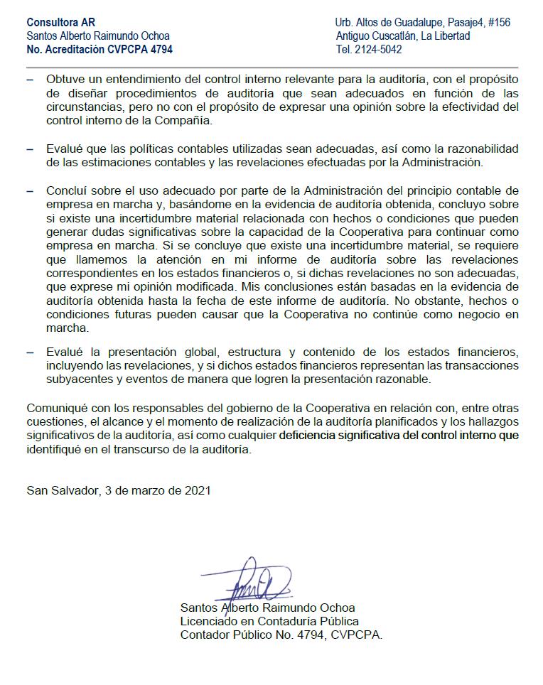 Hemos trabajado en coordinación con el personal administrativo y el Consejo de Administración, a través de una comunicación directa y constante, con el objetivo de verificar que la información contable-financiera sea transparente, eficiente y eficaz, de tal manera que nos permita mejorar continuamente los procesos, y a pesar de los inconvenientes causados por la pandemia de covid-19, todas las observaciones fueron superadas satisfactoriamente.