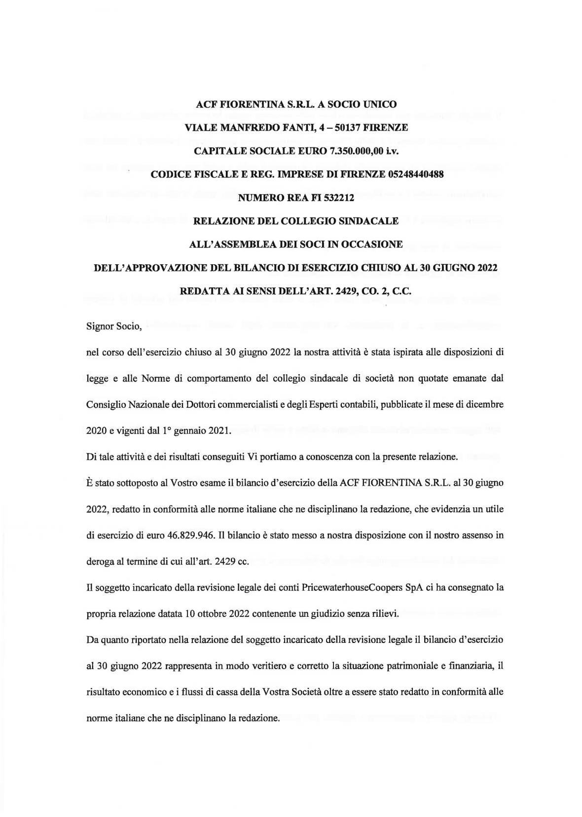 Signor Socio, il presente Bilancio di ACF Fiorentina S.r l. (di seguito anche “Fiorentina” o la “Società”) chiuso al 30 giugno 2022 evidenzia un risultato positivo al netto delle imposte pari a € 46,8 milioni prevalentemente dovuto alla gestione operativa netta dei calciatori che ammonta ad € 117,6 milioni Nella trattazione del presente bilancio è bene ricordare come l’esercizio precedente relativo alla stagione 20/21 sia stato caratterizzato dalla totale assenza dei tifosi e che la stagione 21/22 è stata caratterizzata da vari gradi di limitazione di capienza negli stadi fino ad aprile 2022. Successivamente all’avvio della stagione 21/22, iniziata con una capienza negli stadi ridotta al 50%, la FIGC ha innalzato la capienza al 75%. Il 30 dicembre 2021, un nuovo Decreto Legge recante le nuove misure i per il contenimento della diffusione dell'epidemia da COVID 19 ha disposto una nuova riduzione dell’accesso agli spettatori agli eventi sportivi all’aperto dal 75% al 50%. In data 8 gennaio 2022, la Lega ha deciso di ridurre ulteriormente la capienza degli stadi a 5.000 spettatori per il mese di gennaio Solo a seguito di un nuovo Decreto legge del 24 marzo 2022 la capienza degli stadi è tornata al 100% Fiorentina ha riaperto lo stadio al 100% per la partita casalinga del 3 aprile 2022. Gli effetti persistenti del Covid hanno generato ripercussioni, dirette e indirette, sull’attività economica e finanziaria del club per il periodo di riferimento del presente bilancio. Nella stagione 22/23 non ci sono state finora limitazioni di capienza negli stadi. È in costruzione il Viola Park, nuovo centro sportivo e sede della Società, il cui completamento è previsto per la seconda metà della stagione in corso. Il costo del progetto è stimato in € 100 milioni. Il Viola Park sarà uno dei centri più innovativi d'Europa in termini di organizzazione e strutture e costituirà la base per la futura crescita sportiva del Club. Con una superficie di I 25,6 ettari, sarà uno dei più vasti complessi sportivi in Italia e ospiterà le prime squadre maschili e femminili e le squadre giovanili maschili e femminili in un unico ambiente simile a un campus, unico nel suo genere nel calcio Europeo. Il Nuovo centro sportivo comprenderà molteplici campi di allenamento, due stadi (uno con 3.000 posti a sedere e l'altro con 1.500), un conference center per gli eventi, un edificio per ciascun settore sportivo maschile, femminile e giovanile, un centro multimediale e gli uffici direzionali e aziendali. Da notare che per la prima volta nei suoi anni di storia, la Fiorentina avrà un centro sportivo di proprietà.