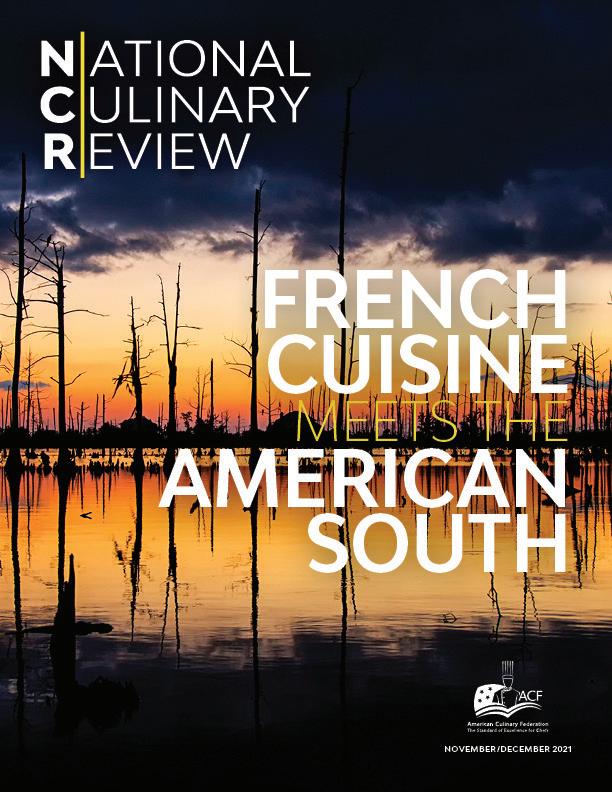 The National Culinary Review® (ISSN 0747-7716), November/ December 2021, Volume 45, Number 6, is owned by the American Culinary Federation, Inc. (ACF) and is produced 6 times a year by ACF, located at 6816 Southpoint Parkway, Ste 400, Jacksonville, FL 32216. A digital subscription to the National Culinary Review® is included with ACF membership dues; print subscriptions are available to ACF members for $25 per year, domestic; nonmember subscriptions are $40. Material from the National Culinary Review®, in whole or in part, may not be reproduced without written permission. All views and opinions expressed in the National Culinary Review® are those of the author and do not necessarily reflect the views and opinions of the officers or members of ACF. Changes of mailing address should be sent to ACF’s national office: 6816 Southpoint Parkway, Ste 400, Jacksonville, FL 32216; (800) 624-9458; Fax (904) 940-0741.