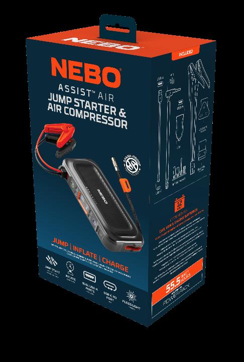 The NEBO® Assist Air Jump Starter is a versatile 4-in-1 tool for your car needs. With 1500 amps of power, it jump-starts 12-volt vehicles (up to 8L gas & 4L diesel engines) and comes with built-in inflation, charging, and light features. The 3-step jump start guide is printed on the storage bag, and it's USB-C rechargeable, functioning as a power bank for your devices. Be prepared for emergencies with NEBO Assist Air.