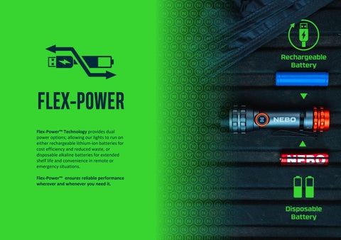 Flex-Power Technology provides dual power options; allowing our lights to run on either rechargeable lithium-ion batteries for cost efficiency and reduced waste, or disposable alkaline batteries for extended shelf life and convenience in remote or emergency situations.